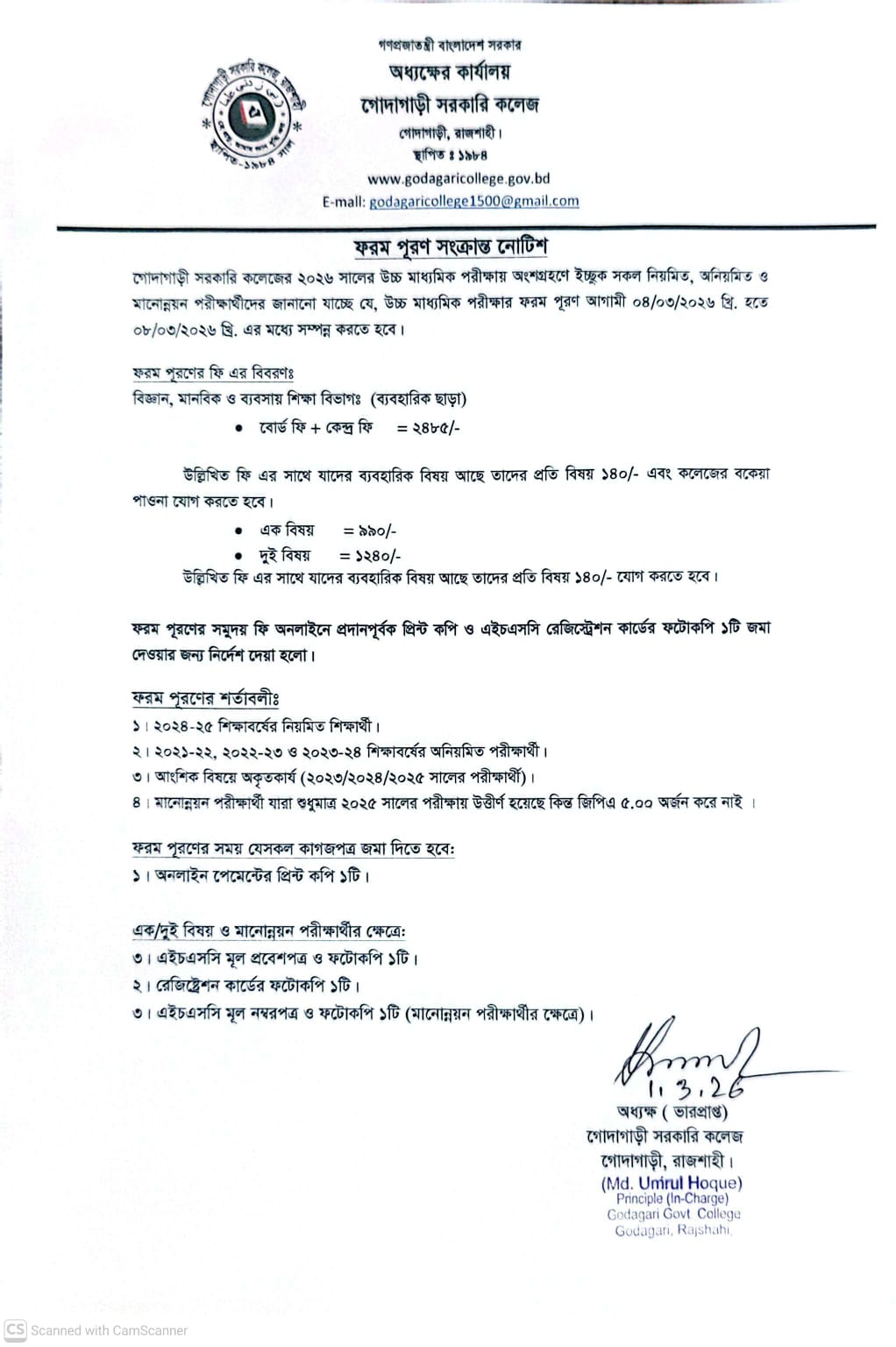 এইচএসসি ২০২৬ ফরম পূরণ সংক্রান্ত নোটিশ